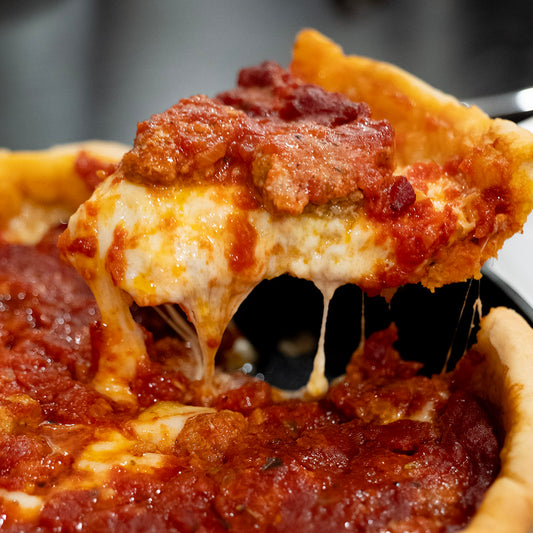 チーズとソースを重ねて焼く、シカゴ名物のごちそうピザ