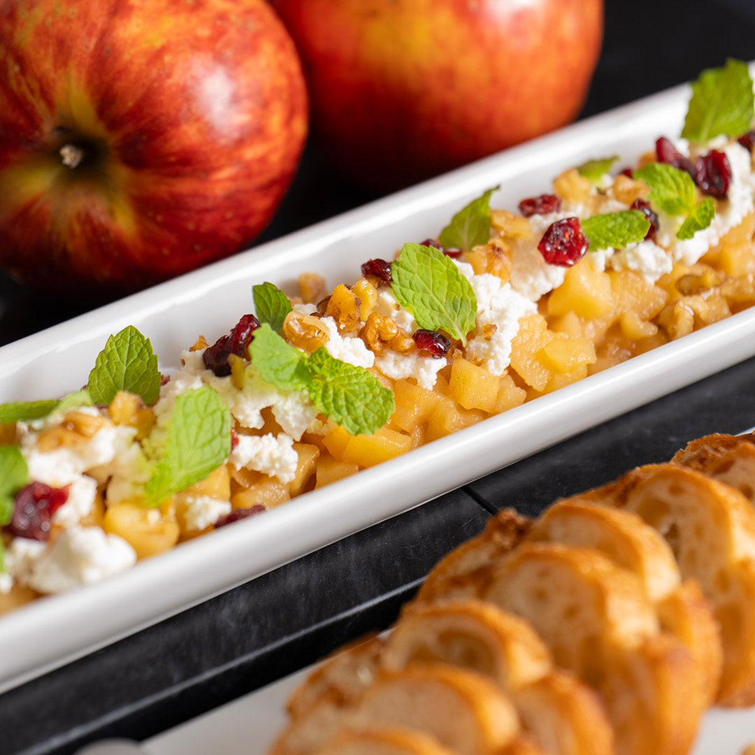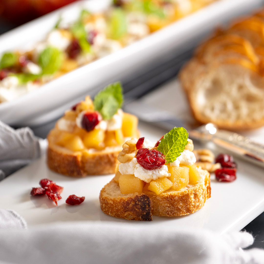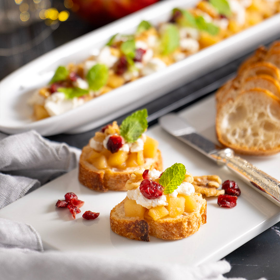 このクロスティーニは、ソテーしたりんごのやさしい甘さと、シェーブルのさわやかな酸味、はちみつの香りが重なり合うひと皿。ワインにも、きっとよく合う組み合わせ。くるみの香ばしさやドライフルーツの甘酸っぱさが加わり、ひとくちごとに味の変化が楽しめます。