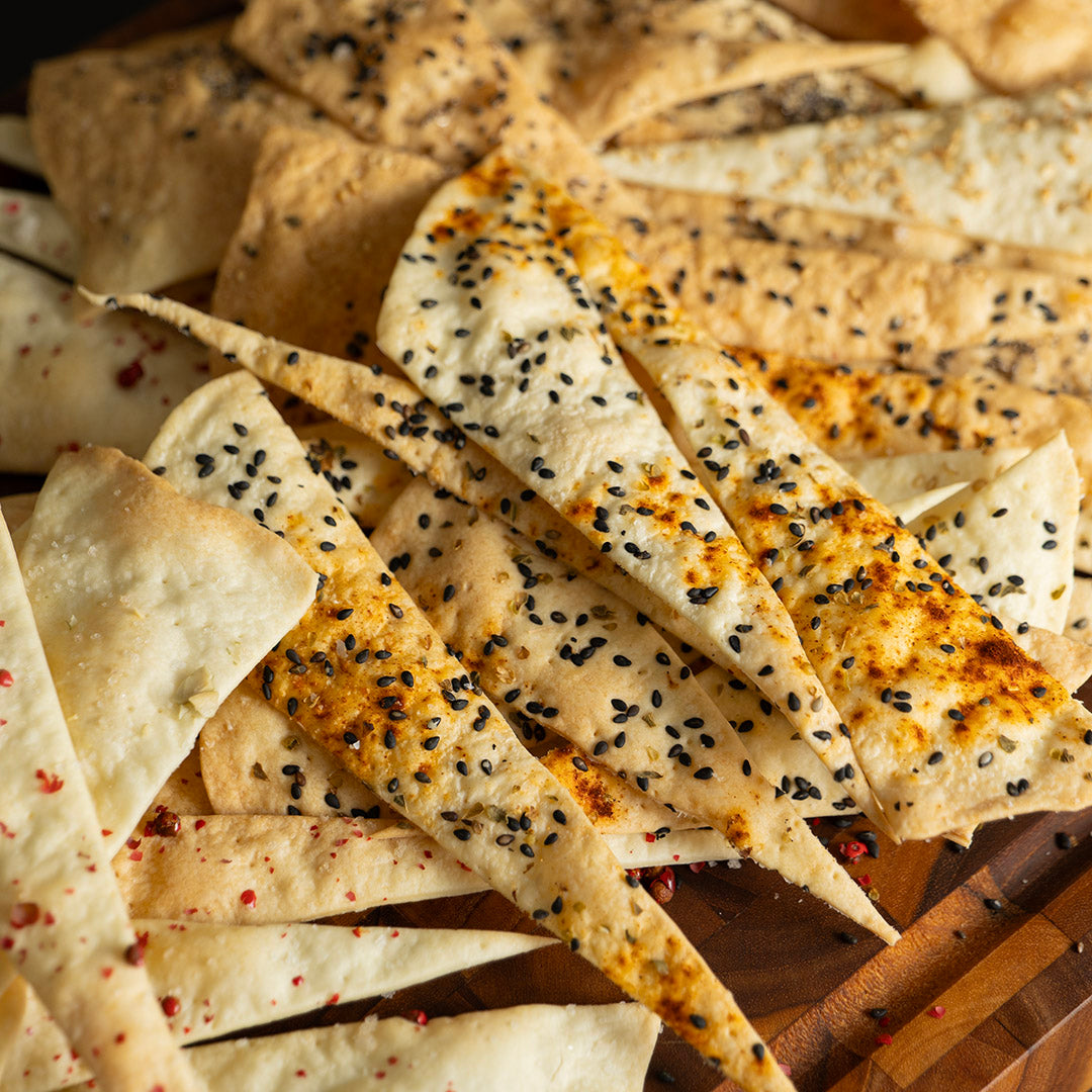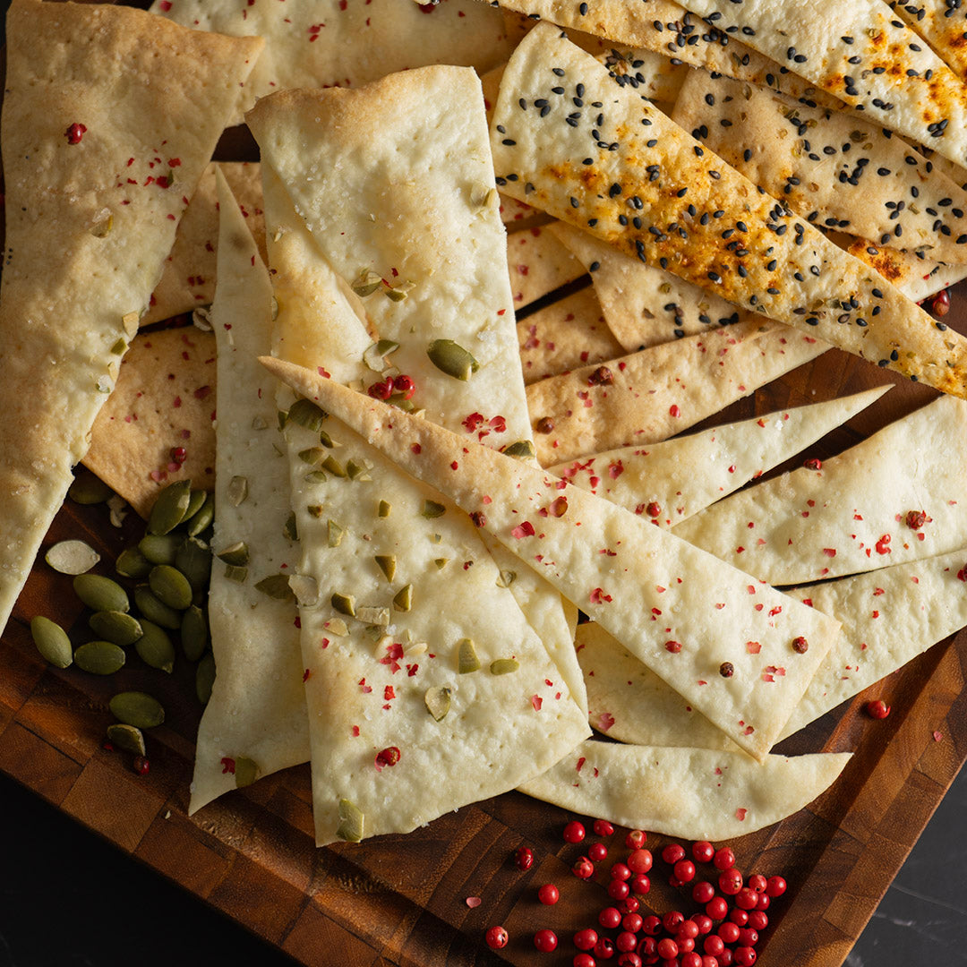 素材はとてもシンプルなのに、驚くほど軽くてパリッとした食感が特徴です。薄く焼き上げたラバシュは、ワインやチーズ、フムスなどのディップとの相性がとても良く、「Lavash Crackers」として定番の一品に。